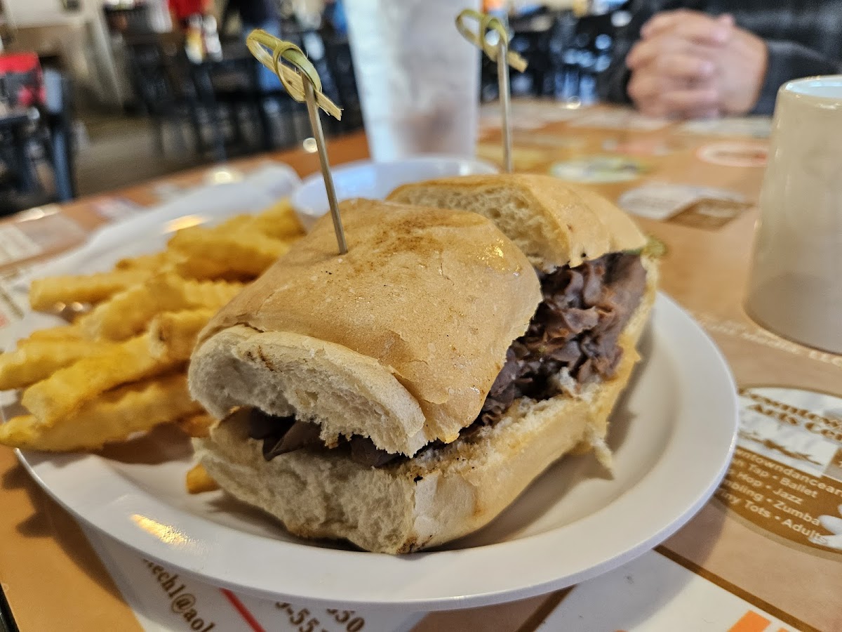 Lunch and dinner options keep the focus on comfort food classics done well — the French Dip sandwich stacked high with fresh beef and a rich au jus, fish and chips that balance a crisp exterior with tender, flaky fish, and sandwiches like the chicken melt and pastrami & cheese cater to those craving straightforward, satisfying flavors. The casual, lively atmosphere reflects a local crowd that enjoys familiar dishes served without fuss but with plenty of care.
